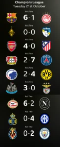 In another explosive UEFA Champions League fixture, PSV Eindhoven came from behind to crush Napoli 6-2, while Arsenal, Newcastle United, and Manchester City all recorded commanding victories.